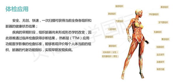 “熱斷層(TTM)技術(shù)”作為一種被動(dòng)接收人體組織細(xì)胞代謝熱,以功能學(xué)為主的醫(yī)學(xué)影像設(shè)備,在醫(yī)學(xué)影像界首次實(shí)現(xiàn)了圖像自動(dòng)分析,無(wú)需醫(yī)生解讀圖像,可在一分鐘內(nèi),快速提供健康檢查結(jié)果。