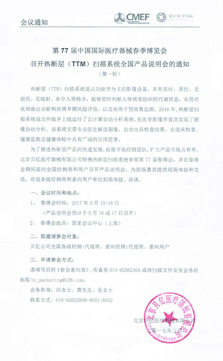 關(guān)于第77屆中國(guó)國(guó)際醫(yī)療器械博覽會(huì) 召開熱斷層(TTM)掃描系統(tǒng)全國(guó)產(chǎn)品說明會(huì)的通知 (第一輪)
