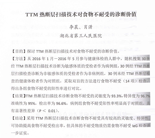 大會(huì)論文匯編收錄了湖北省第三人民醫(yī)院編寫的《TTM熱斷層掃描技術(shù)對食物不耐受的診斷價(jià)值》,研究結(jié)果顯示采用TTM熱斷層掃描技術(shù)診斷食物不耐受具有較高的靈敏度、特異性。